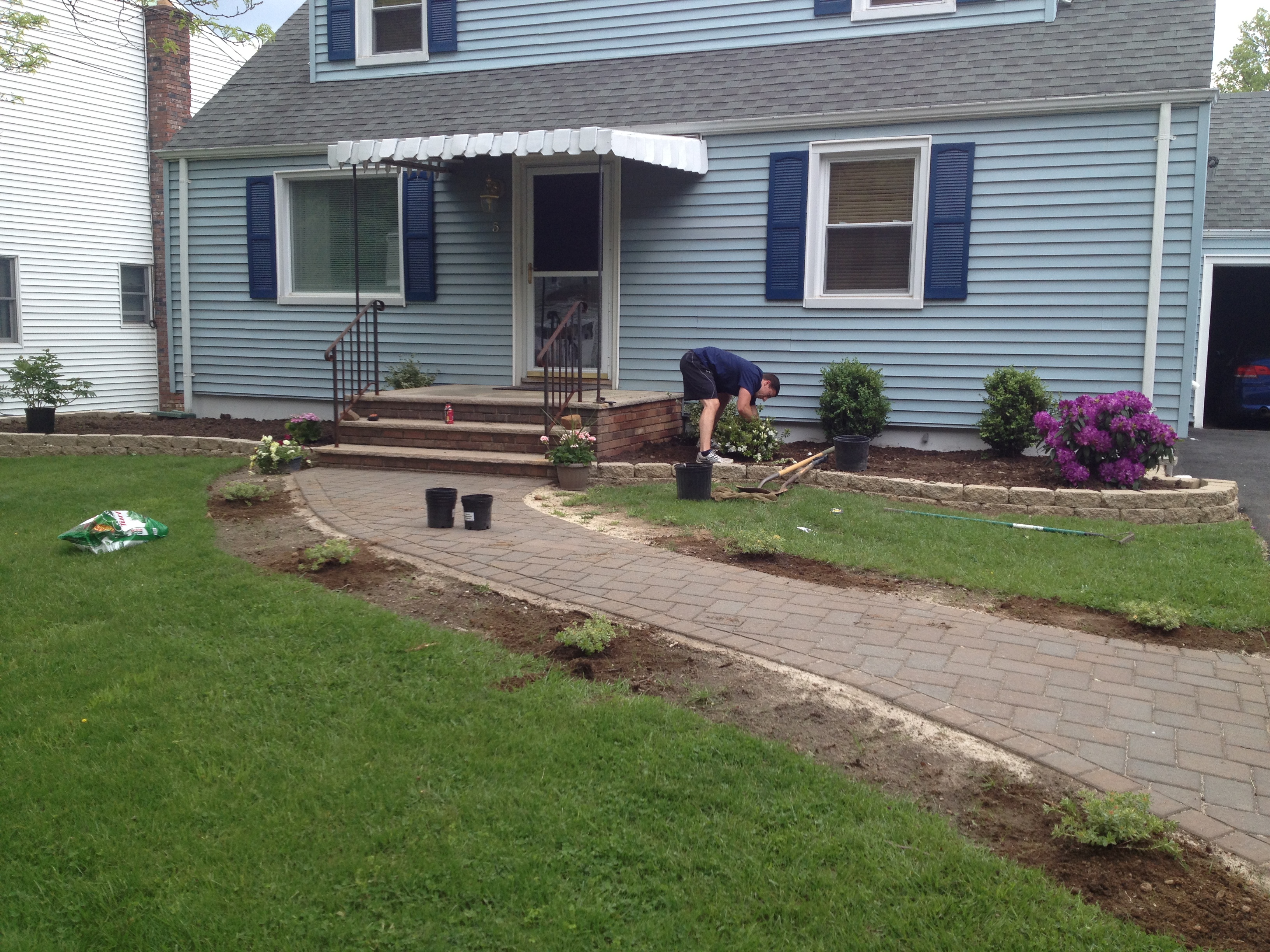 That’s my wonderful hubby diligently working on some landscaping in the spring, since there were literally NO plants in the front (see Operation Curb Appeal- Part One). Maybe the previous owners thought shrubbery would take away from the magnificence of the shanty awning? I guess we’ll never know- but I digress. It’s obviously ugly. We hated it from day one. However, we really didn’t want to take it down without replacing it because it WAS pretty clutch having cover when it was raining out (for both us and the bird family that was living in it), and hiring someone to build a new portico would have been really pricey. Thanks to the confidence instilled in DH by his friend Joe, an architect, who told him what fasteners we would need and said “you can totally build that yourself”, we (he) took on our (his) biggest project yet!